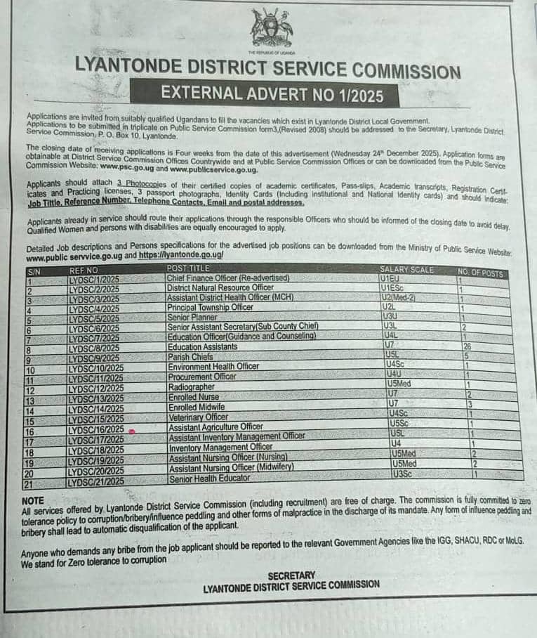 The closing date of receiving applications is Four weeks from the date of this advertisement (Wednesday 24th December 2025). Application forms are obtainable at District Service Commission Offices Countrywide and at Public Service Commission Offices or can be downloaded from the Public Service Commission Website: www.psc.go.ug and www.publicservice.go.ug.